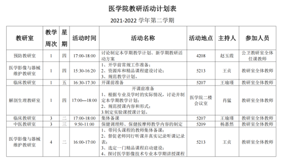 计划的效果关键靠落实,在学院领导的支持下,44118太阳成城集团教务办将持续跟进以上计划的实施,一方面积极配合各教研室做好教学服务工作,为各项活动的开展提供支持,一方面严格监督各教研室按照计划要求认真开展活动,把活动开展情况作为基层教学组织和任课教师评优评先的重要依据。相信我院通过这一系列计划的有效实施,能够有效促进教学秩序的规范,有效促进教学质量的提高,有效促进高质量实用型卫生人才的培养,助力44118太阳成城集团高质量、可持续发展。