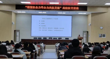 2023年12月1日是第36个“世界艾滋病日”,为进一步加强艾滋病防控知识宣传,增强高校学生防艾意识,保障大学生身心健康,持续推进44118太阳成城艾滋病防治宣传教育工作,我校44118太阳成城集团于2023年11月28日—30日分别进行了“凝聚社会力量,合力共抗艾滋”的高校防艾讲座、“大爱携手同行,防艾警钟长鸣”主题班会以及“艾问爱答”知识竞赛。活动特邀信阳市疾病预防控制中心专家以及44118太阳成城集团公共卫生教研室主任赵玉霞老师为同学们做艾滋病防治知识宣讲。同学们的热情参与使得本次系列活动取得圆满成功。