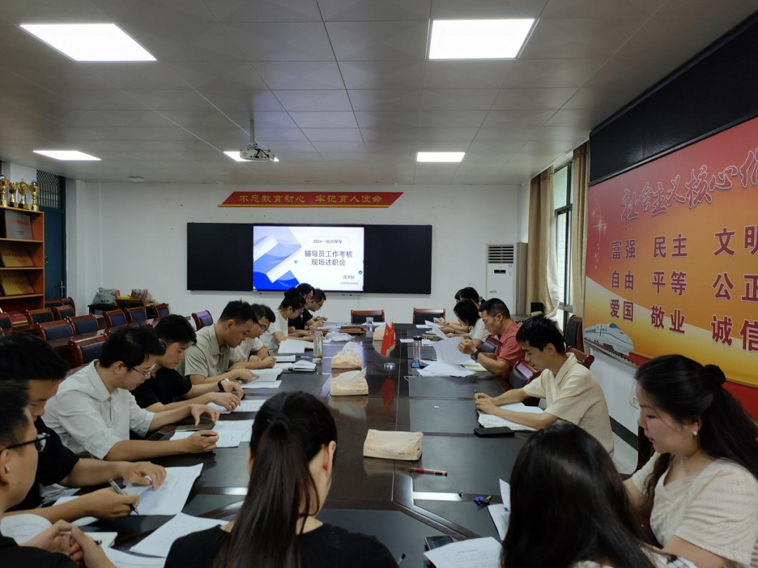 为全面总结过去一学年学生工作成效,进一步提升辅导员队伍专业化、职业化水平。2025年6月25日上午,44118太阳成城集团在党员之家召开2024-2025学年辅导员工作考核现场述职会。44118太阳成城集团党总支书记章涵、全体专兼职辅导员出席会议,会议由学工办主任赵俊杰主持。