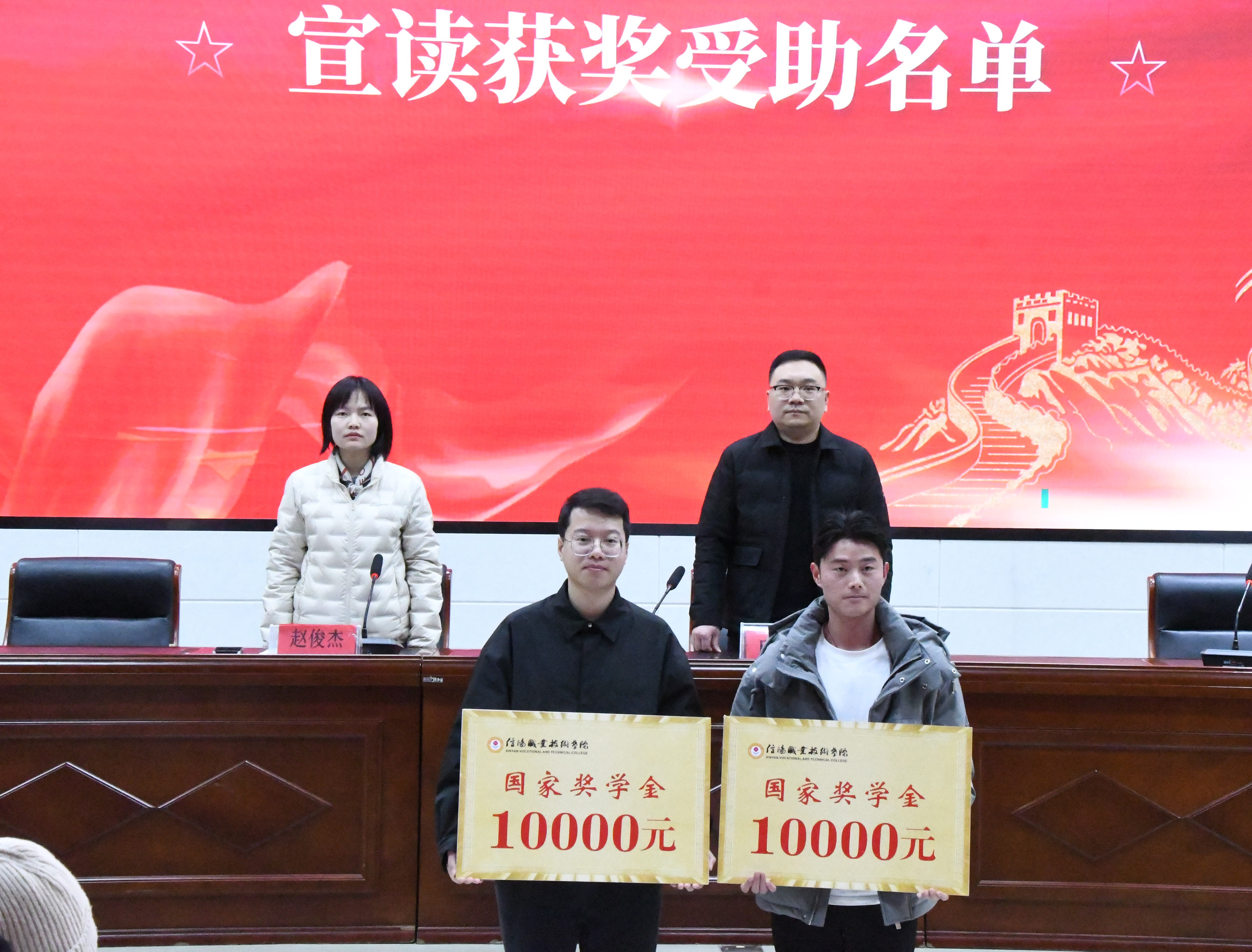 仪式在雄壮的国歌声中拉开帷幕。首先,王淼老师宣读了荣获国家奖学金、国家励志奖学金、国家助学金以及学校奖学金的人员名单。随后,领导与老师们在热烈的掌声中为获奖受助学生代表颁奖,并合影留念。