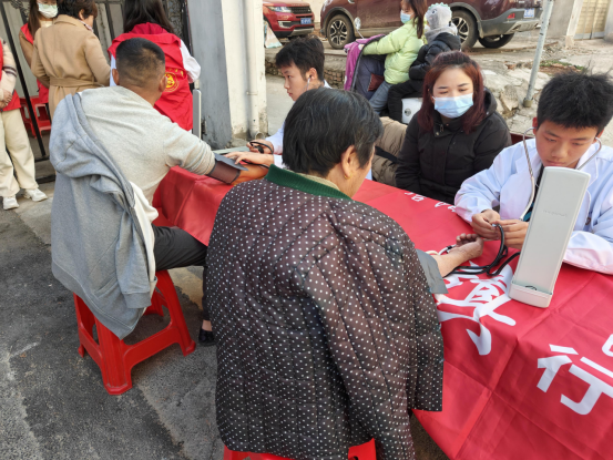 刚到永乐社区门口,就聚集了不少社区民众,志愿者们迅速进入状态,有的为群众测量血压、量身高体重;有的为群众按摩、推拿治疗;有的教社区居民打太极拳;有的打扫卫生,为社区居民们提供各种各样周到的服务。志愿服务的同时,志愿者们与社区居民共话家常。