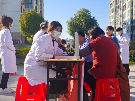 志愿者们在龙飞苑广场设立了志愿服务站点,为社区居民测量血压,宣传高血压防治知识和健康的生活方式。