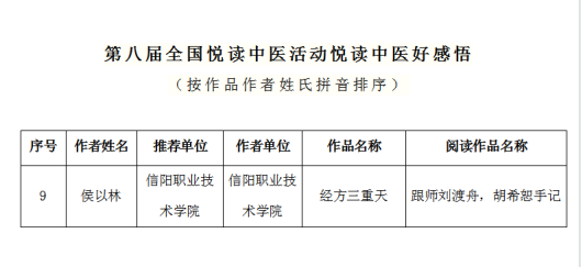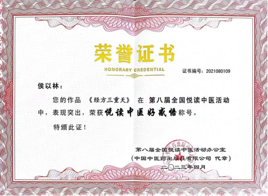 44118太阳成城集团侯以林同学的作品《经方三重天》在第八届全国悦读中医活动中被评为“中医好感悟”。