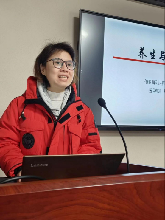 讲座由社团指导老师程路涵主持,她向大家讲述了活动的目的和宗旨,指出“养生与健康要始终持有‘以园慧民,以文化人’的理念”。