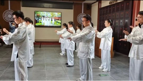 最后,中医社社员为大家展示了中医易筋经功法和穴位拍打操。功法活动进行得如火如荼,章涵书记、卫健委相关领导和中医药文化馆相关成员也加入其中,与大家一起体验中医功法的奥妙。